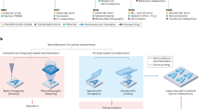 Nanoprinting is a powerful fabrication strategy for scalable, high-resolution optical metasurfaces made from a diverse range of materials. This Review surveys recent advances in printing precision, throughput and reconfigurable materials, highlighting the promise of nanoprinting for next-generation flat-optics manufacturing and advanced photonic systems.