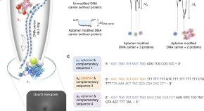 • It is still a challenge for current nanopore sensing methods to differentiate multiple analytes from complex biological material. Here, the authors graft nucleic acid aptamer sequences along the backbone of a double stranded DNA carrier for the detection of multiple protein targets in human serum.