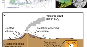 Satellite observations are an important tool in volcano monitoring, but observations such as ground deformation and gas emissions are treated independently. Here, the authors present a model coupling them through their link to magma volatile contents and storage depths prior to eruption
