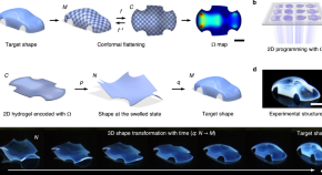Two-dimensional (2D) growth-induced 3D shaping enables shape-morphing materials for diverse applications but quantitative design of 2D growth for arbitrary 3D shapes remains challenging. Here, the authors show a 2D material programming approach for arbitrary 3D shaping, which prints hydrogel sheets encoded with spatially controlled in-plane growth and transforms them to programmed 3D structures.