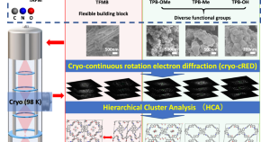 • Structure determination of covalent organic frameworks (COFs) is the key to pushing the development of COF-based materials further but precise determination of the structure of COFs is challenging. Here, the authors develop a universal ab initio structure determination method for polycrystalline 3D COFs using cryo-cRED by combining hierarchical cluster analysis with cryo-EM technique and demonstrate COF structures with atomic preciscion and up to 0.79-angstrom resolution.