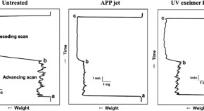 Two dry processings, atmospheric pressure plasma jet exposure and ultraviolet excimer light irradiation, were carried out using poly(ethylene terephthalate) film. The wettability change in the poly(ethylene terephthalate) surface was recorded by the Wilhelmy technique. After the processings, the drastic decreases in the advancing and receding contact angles of water were observed. The advancing angle increased by rinsing with water or aging in air, whereas the receding one remained almost the same. The wettability behavior obtained was discussed on the basis of the X-ray photoelectron spectroscopy and atomic force microscopy data.