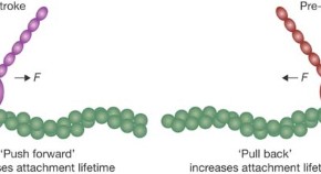 Myosin-V transports intracellular cargo along an actin filament, using a 'hand-over-hand' mechanism that moves it forward in 36-nm steps before dissociating. To achieve long run lengths, the stepping of the two myosin heads must be coordinated. Recent evidence favours the idea that this coordination is achieved by intramolecular strain between the heads, so that myosin prefers to pick up its trailing head first to search for a new actin-binding site, and move cargo forward on the actin.