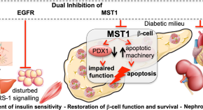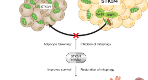 Obesity is associated with mitochondrial dysfunction and chronic metabolic derailment. Cho et al. report that elevated adipose expression of the Hippo kinases STK3 and STK4 (STK3/4) in obesity and type 2 diabetes decreases the mass and oxidative capacity of adipocyte mitochondria. Genetic or pharmacological inhibition of STK3/4 restores mitochondrial mass and function in adipocytes and improves glucose homeostasis in mice with diet-induced obesity. These findings support STK3/4 as new targets for obesity-related diseases.