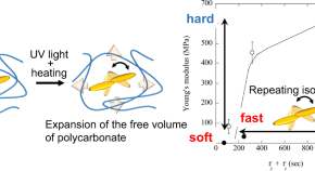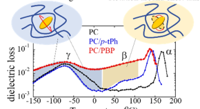 Adding rod-like low-mass molecules (LMs) increases the elastic modulus of polycarbonate (PC). The anisotropy of the rotational dynamics of rod-like LMs in PC was investigated by dielectric relaxation and dynamic mechanical analysis. Two rotations of the LM around the short and long axes were separately observed at 80 °C and −100 °C, respectively. The rotation of the LM around the short axis was cooperative with the local dynamics of PC and. In contrast, the rotational motion around the long axis was independent of PC motions.