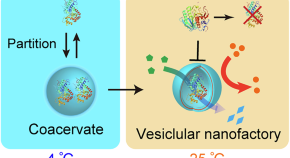 Nanofactories are artificial vesicles that shields the internal enzymes while allowing small substrates to permeate the membranes for catalytic reactions. A key challenge in nanofactories is achieving efficient enzyme encapsulation. The constructed self-assembled vesicles from a thermoresponsive peptoid-based block copolymer achieved a high enzyme encapsulation efficiency of more than 50%. It is hypothesized that this high performance stems from a temperature-induced coacervate-to-vesicle phase transition. The resulting enzyme-loaded vesicles acted as robust nanoreactors, protecting enzymes from external proteases, while exhibiting selective permeability of small molecules on the basis of physicochemical properties.