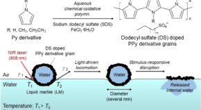 Polypyrrole and poly(N-alkyl pyrrole) grains were synthesized by aqueous chemical oxidative polymerization in the presence of sodium dodecyl sulfate as both a dopant and a hydrophobizing agent. The dried polypyrrole and poly(N-ethyl pyrrole) grains showed hydrophobic character and can act as a light-responsive liquid marble stabilizer. Locomotion of the liquid marble can be driven by near-infrared laser irradiation-induced Marangoni flow on a planar air–water surface. Furthermore, the release of internal liquid can be achieved by controlled disruption of liquid marbles via external stimulus application.