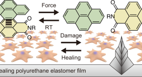 Self-healable and cell-compatible polyurethane elastomers cross-linked by charge-transfer complexes between electron-rich pyrene (Py) and electron-deficient naphthalene diimide (NDI) were fabricated by simply blending two linear polymers with Py or NDI as a repeating unit. The elastomers with different blend ratios self-healed damage over 1 day in mild conditions, including in air and water at 30–100 °C. The good cell compatibility of the polyurethane elastomers was demonstrated by culturing two kinds of cells on the thin film substrates.