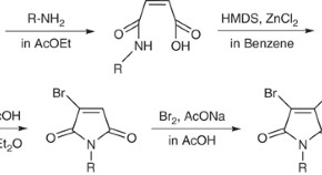 Coupling polymerizations of 2,3-dibromo-N-substituted maleimide (DBrRMI) (R=benzyl (DBrBnMI), phenyl (N-phenyl-2,3-dibromomaleimide (DbrPhMI)), cyclohexyl (N-cyclohexyl-2,3-dibromomaleimide), n-hexyl (N-n-hexyl-2,3-dibromomaleimide) and n-dodecyl (N-n-Dodecyl-2,3-dibromomaleimide, DBrDMI)) were carried out using palladium or nickel catalysts. Number-average molecular weights (Mn) of poly(RMI-alt-Ph) or poly(RMI-alt-TP) obtained by Suzuki–Miyaura cross-coupling polymerizations of DBrRMI with benzene-1,4-boronic acid (PhDB) or 2,5-thiophene diboronic acid (TPDB) were 680–1270 by GPC analyses. In contrast, coupling polymerizations of DBrRMI with 1,4-diiodobenzene gave random poly(RMI-co-Ph). Poly(RMI-co-Ph)s exhibited higher thermal stability than monomer and poly(RMI-alt-Ph). Copolymers showed strong photoluminescence from yellow to light blue color in THF.