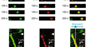 The mechanics of MMR strand specific excision that begins at a distant ssDNA break are not yet clear. Here the authors have used multiple single molecule imaging techniques to visualize the behavior of MMR components on mismatched DNA substrates and reveal an exonuclease-independent mechanism for E.coli MMR.