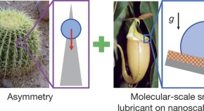 A surface engineering approach is described that is inspired by the water-condensation capability of the bumps on desert beetles, the droplet transportation facilitated by cactus spines and the slippery coating of the pitcher plant, to produce a structure with many water-harvesting applications.