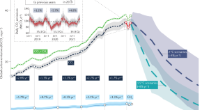 Following record-level declines in 2020, near-real-time data indicate that global CO2 emissions rebounded by 4.8% in 2021, reaching 34.9 GtCO2. These 2021 emissions consumed 8.7% of the remaining carbon budget for limiting anthropogenic warming to 1.5 °C, which if current trajectories continue, might be used up in 9.5 years at 67% likelihood.
