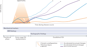 No drugs are currently approved that change the natural course of osteoarthritis (OA) and translate to long-term, clinically relevant benefits. Two-stage clinical trial designs for OA have now received FDA approval, but remaining challenges lie in defining suitable study populations, surrogate outcomes and pivotal long-term, clinically relevant trial endpoints.