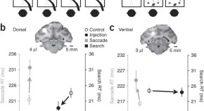 Lateral intraparietal cortex (LIP) has been implicated in both attention and oculomotor control, but whether these functions are spatially overlapping remains unknown. Here the authors co-injected muscimol, to temporarily inactivate areas of LIP, and manganese, to enable MRI imaging of the inactivation site. They found that dorsal LIP is primarily an oculomotor planning area, whereas ventral LIP shows dissociable circuits for both attentional and oculomotor processes.