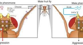 • Long-term exposure to females reduces aggression of male fruit flies. The mechanism involves contact-dependent pheromone sensing and the activation of a small group of GABAergic inhibitory neurons unique to the male brain.
