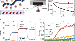 Label-free detection of nucleic acids such as microRNAs holds great potential for early diagnostics of various types of cancers, but insufficient detection limits hamper applicability. Here, the authors use nitrogen-vacancy centers in diamond to measure the intrinsic magnetic noise of paramagnetic counter ions interacting with microRNAs, lowering the detection limit to ~23 miR-21s.