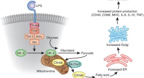 • The activation of dendritic cells by Toll-like receptors leads to a rapid enhancement in glycolysis. Glucose is metabolized to pyruvate and from there to citrate in the mitochondria, which leads ultimately to membrane biosynthesis in the endoplasmic reticulum and Golgi to support the activation of dendritic cells.