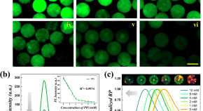 Alkaline phosphatase (ALP) is one of the most extensively distributed enzymes existed in living species, which could act as crucial prognostic indicators for various diseases. Here, we present novel hybrid photonic alginate hydrogel microparticles for ALP detection. An intermediary chemical, the pyrophosphate ion (PPi), was introduced to trigger the phase transition of the copper alginate hydrogel, while ALP can react with PPi and suppress the process. This response can be converted into dual optical readouts, a fluorescence signal and a structural color signal. Quantitative determination of ALP was established based on this dual-indicator system with high accuracy and reliability.