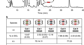 Structurally divergent reactions on racemic mixtures, which produce distinct chemical species from an enantiomeric mixture, are extremely rare in the literature. Here, the authors are able to use a dynamic combinatorial approach to yield structurally divergent, non-isomeric [2]catenanes from an enantiomeric mixture.