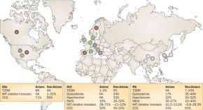 An individual's risk of developing cardiovascular disease is somewhat dependent on their ethnic origin, and is increased by the presence of inflammatory rheumatic disease. However, little is known about the relative contributions of ethnicity and rheumatic disease activity to a patient's overall risk of cardiovascular morbidity and mortality. This Review explores known risk factors for, surrogate markers of, and the epidemiology of heart disease in Asian and non-Asian patients with rheumatic diseases.