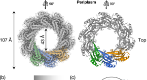 Chen et al. determined the cryo-EM structure of the TraT exclusion protein from the F plasmid of E. coli, revealing a unique hollow homodecameric architecture that includes α-helices traversing the outer membrane. Their work indicates that TraT might limit plasmid transfer via physical interference, offering insights into controlling antimicrobial resistance.