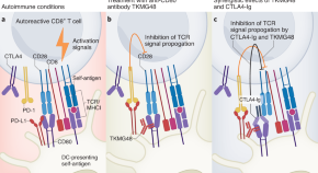The binding of PD-L1 to CD80 on antigen-presenting cells prevents PD-1 ligation on T cells. Therapeutic blockade of the cis-PD-L1–CD80 interaction liberates PD-L1 to bind to PD-1, inhibits autoreactive T cells and robustly alleviates autoimmune symptoms.