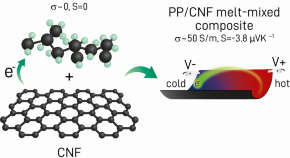 • The higher negative Seebeck coefficients (S) at 30 °C of as-received carbon nanofibers (CNFs) with respect to their polypropylene carbon nanofiber (PP/CNF) melt-mixed composites are explained by a slight electron donation from the outer graphitic shells of the CNFs to the PP molecules. Our study denotes that, contrary to expectations, insulating polymers may play a non-negligible role on the final S-values of conductive polymer composites composed of carbon-based nanostructures.