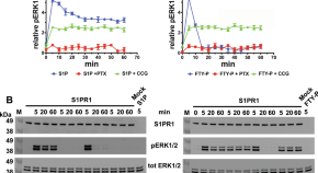 Patrone et al study the mechanism by which fingolimod, a drug used for multiple sclerosis, and agonist to G-coupled receptor S1PR1, compared to the endogenous ligand S1P. They find that whereas S1P binds a S1PR1 dimer, the action of fingolimod is dependent on receptor oligomerisation, which affects β-arrestin binding, internalisation and signaling.