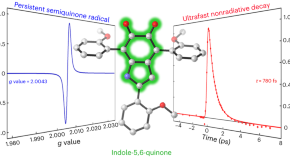 Indole-5,6-quinone (IQ) is a long-sought intermediate and structural subunit of eumelanin pigments whose instability has precluded isolation and characterization. It has now been shown that a sterically shielded derivative of IQ exhibits hallmark eumelanin properties, including near-infrared absorption, ultrafast nonradiative decay and a persistent semiquinone radical formed by comproportionation.