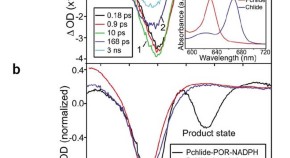 The chlorophyll biosynthetic enzyme NADPH:protochlorophyllide oxidoreductase, which catalyses a light-driven reaction involving hydride and proton transfers is examined. It is determined that prior excitation of the enzyme–substrate complex with a laser pulse induces a more favourable conformation of the active site and increases the catalytic efficiency of the coupled hydride and proton transfer reactions. Spectral changes in the mid-infrared after the absorption of one photon reveal significant conformational changes in the enzyme.