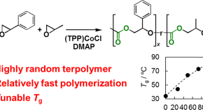 A highly random terpolymer of CO2, styrene oxide (SO), and propylene oxide (PO) was realized by using a tetraphenylporphyrinatocobalt(III) chloride ((TPP)CoCl)/4-dimethylamino pyridine (DMAP) catalyst system. In contrast, gradient terpolymers were formed in the cases of CO2, cyclohexylethylene oxide (CyEO), tert-butylethylene oxide (tBuEO) or 1-adamantylethylene oxide (AdEO), and PO. The glass transition temperatures (Tgs) of these terpolymers are tunable between that of the copolymer of CO2 with PO (34 °C) and that of the copolymers of CO2 with the corresponding epoxide with bulky side groups.