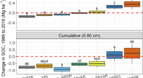 Restored prairies and rotationally-grazed pastures maintain soil carbon while row crop systems lose soil carbon, according to a 30-year longitudinal, compaction-corrected, full-soil profile analysis in Wisconsin, USA.
