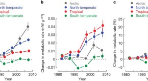 Temperature increase does not have a linear effect on an organism's biology. These authors use observed global temperature change to calculate the change in metabolic rate for ectotherms. Despite smaller temperature increases in the tropics, these areas, which contain the largest proportion of biodiversity, are likely to experience just as much change in metabolic rate.