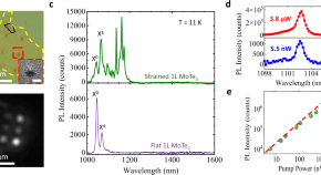 Single-photon emitters in 2D semiconductors hold promise for quantum applications, but usually operate in the 500-800 nm wavelength range. Here, the authors report site-controlled creation of quantum emitters in the telecommunication wavelength window by coupling 2D MoTe2 to strain inducing nano-pillar arrays.