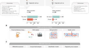 Cancer detection is challenging, especially in patients with diffuse symptoms that overlap with non-malignant conditions. Here, the authors develop a proteomics- and minimally invasive blood sampling-based classification model as a triage tool to identify and prioritize individuals at high cancer risk that would benefit the most from rapid and highly sensitive diagnostic modalities.