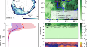 • Annular phytoplankton blooms over the seamount Maud Rise in the Antarctic Ocean are linked with the presence of heat and dissolved iron upwelled from the deep sea through interactions between the ocean circulation and the topography of the seamount.