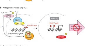 How the unique chromatin configuration of embryonic stem cells (ESCs) integrates inputs from exogenous stimuli to maintain pluripotency remains largely unknown. The ESC-specific ATP-dependent chromatin-remodelling (esBAF) complex maintains the accessibility of the target sites of Stat3, a leukaemia inhibitory factor (LIF) signalling effector, by preventing repressive localized polycomb-mediated trimethylation of Lys 27 of histone 3 (H3K27me3).