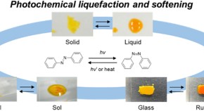 This review focuses on the recent developments on the photo-induced liquefaction and softening of azobenzene-based materials. The trans–cis photoisomerization of azobenzene units incorporated in molecular materials, polymers, and gels induces a variety of state changes such as solid–liquid, gel–sol, and glass–rubber transitions of those materials isothermally. Several novel applications such as reusable and environmentally friendly photoresists, reworkable adhesives, and self-healing materials can be expected using the photochemical liquefaction and softening.