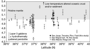 • Analysis of isotope data from the Azores Islands provides evidence for deep recycling of material that had undergone fractionation near the Earth's surface. It is though that this component is from melt- and fluid-depleted lithospheric mantle and is 2.5 billion years old, whereas other Azores basalts have been estimated to contain from ∼3 billion-year-old melt-enriched basalt.