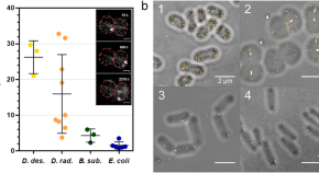 Deinococcus radiodurans is a relatively large spherical bacterium with a multipartite genome. Here, the authors study the coordinated morphological changes at the cellular and nucleoid level as the bacteria progress through the cell cycle, showing complex nucleoid organization and dynamics.