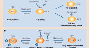 One way to regulate the activity of transcription factors is to control the amount of time that they spend in the nucleus. This, in turn, can be modulated by exposing or blocking nuclear-localization and nuclear-export signals. A new regulatory mechanism is now proposed for a transcription factor called NF-AT4, and it seems that two other proteins, calcineurin and Crm1, compete for binding. The outcome of this battle determines whether an import or an export signal is uncovered.