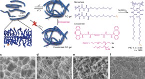 Unlike synthetic hydrogels, biological gels are made of fibrous networks which give rise to unique properties, such as high porosity and mechanical responsiveness. Here the authors use polyisocyanide-based gels and selectively crosslink inside the bundles to lock the fibrous network and thus control the architecture and the mechanics.