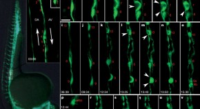 One of two papers showing the generation of haematopoietic stem cells (HSCs) from the ventral wall of the dorsal aorta in live zebrafish embryos. Here, using imaging of live zebrafish, HSCs are shown to emerge directly from the aorta floor. This process does not involve cell division but movement of single endothelial cells out of the aorta ventral wall into the sub aortic space, where they transform into haematopoietic cells.