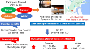 We demonstrated the study enrollment, the hot-spring contents and location, and physiological changes of general trends or seasonal variations, which may indicate potential benefits and risks during and after bathing. (Abbreviations: BP, blood pressure; PP, pulse pressure; LV, left ventricular; CO, cardiac output; HR, heart rate; cSBP, central systolic blood pressure; cDBP, central diastolic blood pressure).