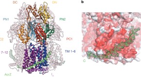 The crystal structure of mouse SCD1 bound to fatty acid stearoyl-CoA is solved at 2.6 Å resolution; the structure reveals a novel geometry for the dimetal centre, and the acyl chain of the bound fatty acid is shown to be shielded and shaped to a particular conformation by the enzyme, providing a structural basis for the selectivity of fatty acid metabolism.