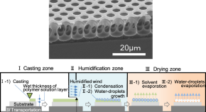 “Breath figure formation” during the casting process of polymer solutions under high atmospheric humidity provides honeycomb-patterned polymer films (honeycomb films) with regularly arranged micropores. The development of production technology for large-area honeycomb films is indispensable for their various applications. Manufacturing equipment consisting of three zones (for casting, humidification, and drying of polymer solutions) for successive formation of large-area honeycomb films was newly designed and constructed. By using this equipment, physicochemical experimental parameters, e.g., the surface temperature of polymer solutions, dew point of the humidification zone, humidification time, and interfacial tension between water and the polymer solution, were effectively changed to optimize the density and size of condensed water droplets. Large-area honeycomb films were formed by a roll-to-roll process. Herein, recent developments in biomedical applications of honeycomb films are described.