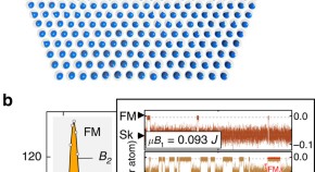 Magnetic skyrmions are swirling magnetization textures which are topologically stabilized in helical magnets under an applied magnetic field. Here, the authors use Monte Carlo simulations to explore the stability of skyrmions against a ferromagnetic phase and their potential as single bits.