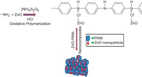 Recently, polymer matrix-based nanocomposites have become a prominent area of current research and development in optics, optoelectronic, biomedical, electrical and electronic applications. Organic polymer-based electronic devices offer the potential for lower cost and more flexible manufacture but need significant improvements in both efficiency and long-term stability. Therefore, we have made an attempt to synthesize polyaniline (PANI)–zinc oxide (ZnO) using chemical and emulsion polymerization techniques. The properties of ZnO–PANI films were then systematically characterized with several physical techniques. The electrochemical investigations revealed that the individual redox properties of ZnO and PANI can be maintained in a nanocomposite ZnO–PANI system. Further, results indicated that ZnO–PANI films could exhibit a wide potential window. Moreover, we have observed the formation of a single-layer nano-Schottky junction in the ZnO–PANI film, and interesting positive temperature coefficient properties in ZnO–PANI.