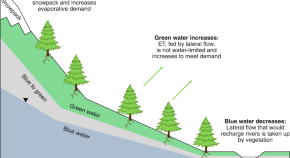 The impacts of climate change on the ecohydrology of forested mountain regions are uncertain. New high-resolution modelling suggests that during a hot, dry summer in the Alps, stressed vegetation capitalizes on downslope water subsidies, amplifying runoff deficits and further depleting water resources.