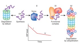 Intrinsically disordered proteins (IDPs) are subject to ubiquitin-independent degradation, a default and passive process. We describe here a model wherein a group of 'nanny' proteins function to protect newly synthesized IDPs from degradation by default, thereby insuring their maturation into important regulatory molecules.